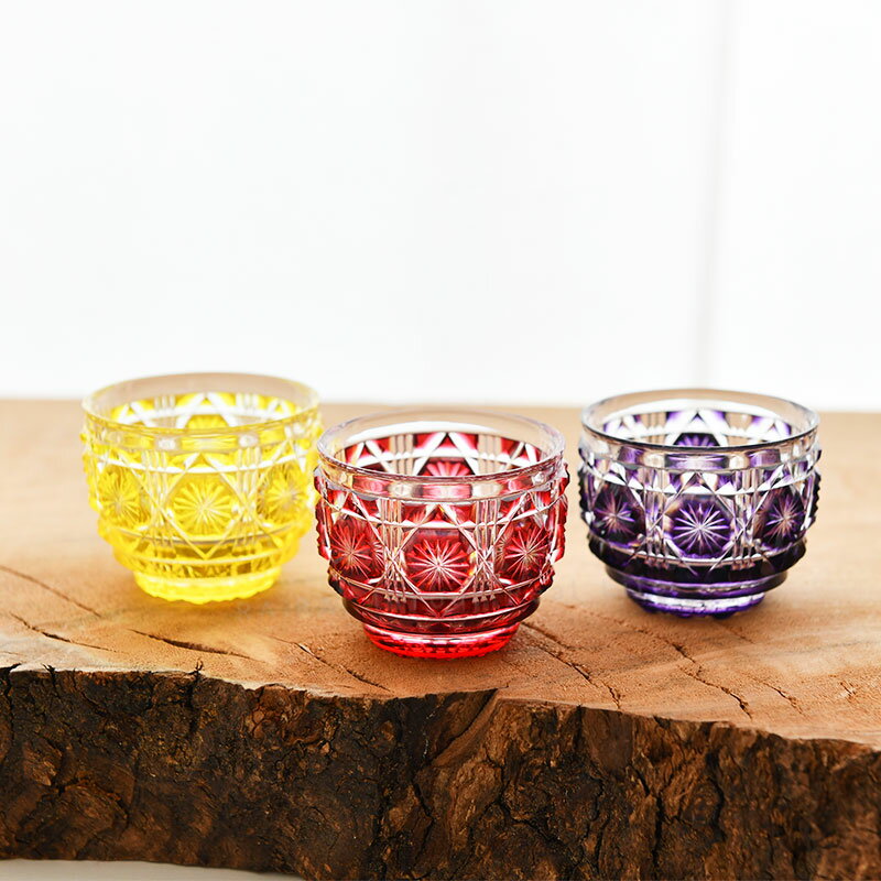 薩摩切子とともに名が挙がるものに江戸切子がありますが、江戸切子のガラスは薄めです。透明ガラスだけでなく色ガラスも薄いため透明感があり、カット部もすっきりしておりシャープな印象です。また、透明ガラスをカットする場合もあります。