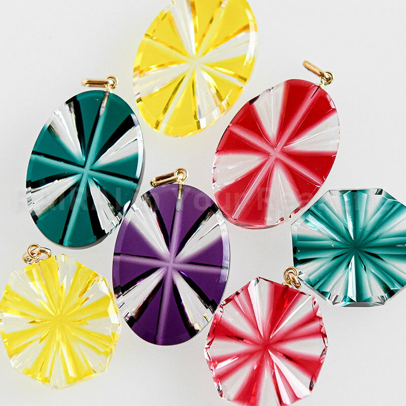 薩摩切子の一片を切り取ったような美しいミニペンダントです。形は2×2センチの八角形。色は紅・藍・緑・金赤・黄色・島津紫のラインナップ。